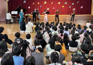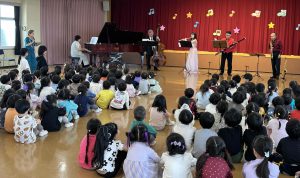 昨日8日(水)、幼稚園の5階ホールに小野理事長先生をはじめ音楽家のみなさんが6名来て「芸術の秋のコンサート」が行われました。