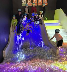 大きなボールプールでは、思いっきり飛び込んだり滑り降りたり、ボール合戦をしたり…。