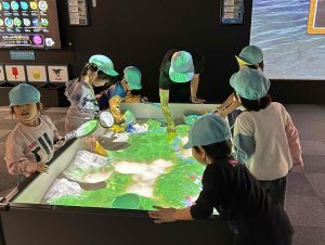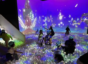 プロジェクターを使って、床や壁にいろいろなゲームや遊びコーナー、算数コーナー、音楽コーナー、大きなボールプールや砂場、お絵かきコーナー…といろいろ。