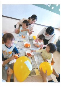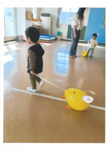 この日から、後期のにこにこクラブがスタートしました💡新しいお友達も仲間入りし、賑やかに過ごしました✨教室で制作をしてから、ホールへ移動。風船でできた、犬のお散歩をしましたよ。いつもの風船遊びとは違う、楽しみ方を知りました😊