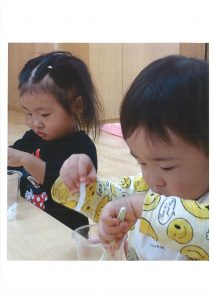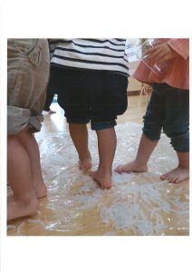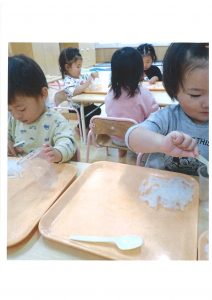 りす組(1歳)・ぺんぎん組(2歳)のクラスで、【感触遊び】を楽しみました😊手で触ったり、スプーンですくったり、素足で踏んでみたり~。本当は、味がついた状態の物を食べたことがあるかもしれませんが…今日は、「つきこんにゃく」の感触を楽しむ経験をしました。素足での感触は、何だか???不思議⁈と感じる子もいたようです😐