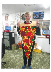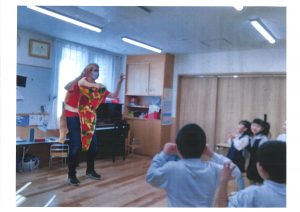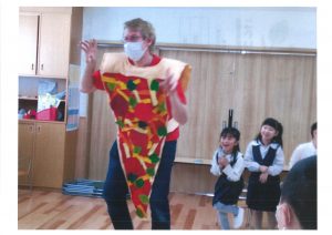 毎週月曜日は英語教室があり、デイビット先生とクリスティーン先生が来て楽しい英語のレッスンをしてくれています。今日のデイビット先生は、ハロウィン仕様でピザに変身!ナントこのピザの衣装は、デイビット先生のお手製✨✨子どもたちもデイビット先生を見て大喜びでした🎵