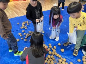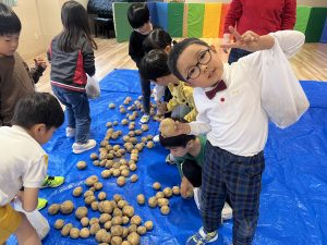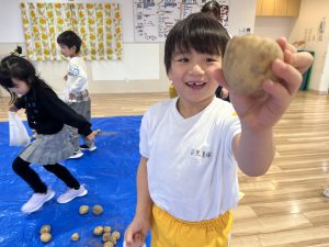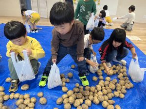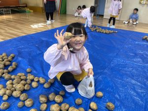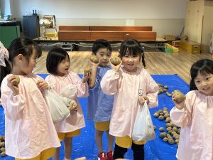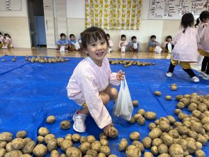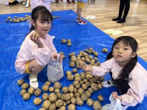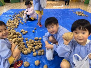 先日、当別の森本農園からじゃがいもが 届きました! 今年は、芋ほり遠足が中止となり残念で したが、いちご組とあさがお組の子供た ちは、芋ほりに行ったつもりで、ビニー ル袋に自分で拾ったじゃがいもを詰めて 「芋ほり体験」を楽しみましたよ。 持ち帰ったじゃがいもは、色々な手料理 に変身するのでしょうね。 カレーライス、ポテトサラダ、フライド ポテトかな~? ご家族で、美味しく召し上がって下さい。