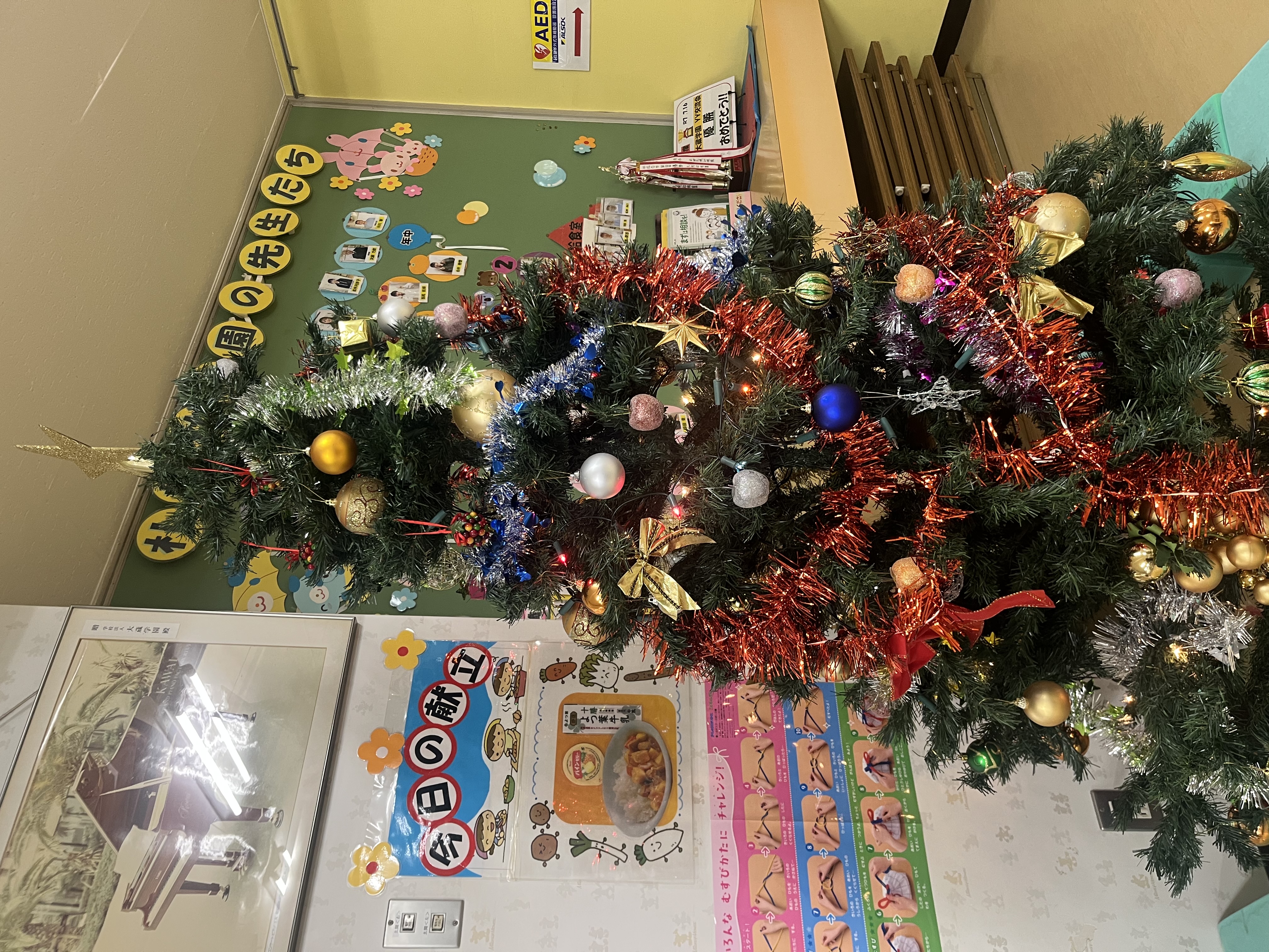 幼稚園の玄関には、大きなクリスマスツリーを飾りました🎄✨