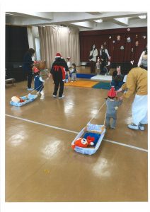 手作りサンタ帽子を作り、先生の出し物や親子でゲームを楽しみました🎵