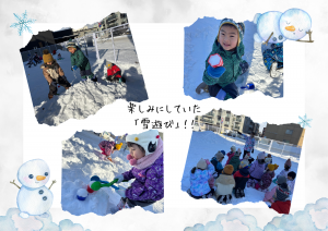 初雪の時から楽しみにしていたので、外に出た瞬間「キャー😊!」という元気な声が園庭に響いていましたよ。