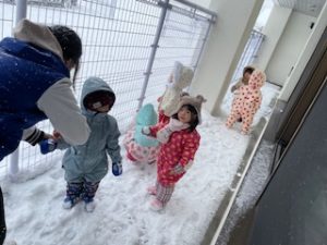 ぺんぎん組が雪遊びを行いました。雪が降っていたので、園庭ではなくベランダでの雪遊びでしたが、みんな