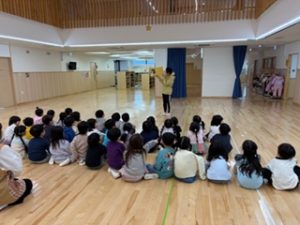 預かり保育の中での読み聞かせの様子です。子どもたちは、お話の世界に入り込み最後まで集中していました。