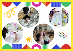 絵の具が落ちた瞬間、クレヨンの線がふっと浮き上がり、子どもたちの「わっ」という声が部屋に広がりました️☺️ 「はじき絵って、思いがけない模様が出てくるのが楽しい」と楽しんでくれました✨