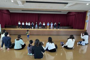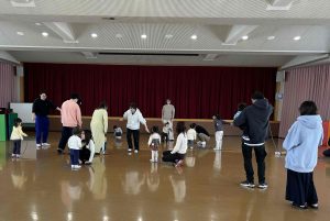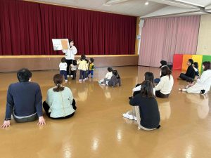 遊んだ後は、年少「うさぎ組」「ひよこ組」「ぱんだ組」の歌の発表、絵本の読み聞かせ。最後は、みんなで「からだダンダン」を元気に踊りました。