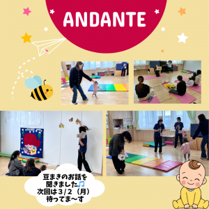 本日は、子育てサロン『Andanteあんだんて』を開催しました お母さんの膝の上で絵本『豆まき』を楽しむ子どもたちの姿が、とても穏やかな時間をつくってくれました✨ 明日の豆まきで、みなさんのお家にたくさんの福が訪れますように♪