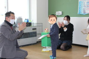 幼児クラスは、ホールを使って年少・年中・年長のお友達、先生、そしてお家の方に来園していただき、乳児と同じようにお子さんの成長の姿と感謝の気持ちを伝えます。乳児のお誕生会との違いは、毎回出し物があることです。各クラスのダンスや歌、先生や園長先生の出し物もあります。1月の出し物は、園長先生の「読み聞かせ」でした。楽しい絵本を読んでもらい、大喜びの皆さんでした。