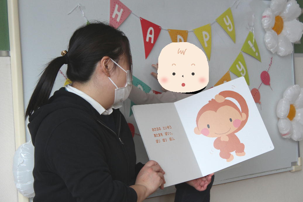乳児クラスのお友達は、保育室でお友達、先生、そしてお家の方でお祝いをします。始まりは、先生の読み聞かせからです。お誕生日の歌を歌ったり、お誕生カードを受け取ったりと楽しい時間を過ごします。