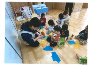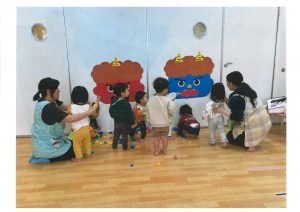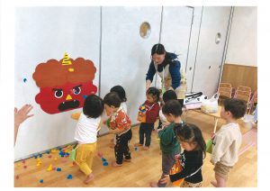 1歳児クラス・りす組の子どもたちが、豆まきについてほのか先生からのお話を聞いています。真剣な顔で、正座をする可愛い姿✨✨しっかりお話を聞き、楽しく豆づくりをしました💡「鬼はそと~、福はうち~」の声は小さめでしたが、鬼退治できました‼お家での豆まきは、きっと上手に出来ますね👹