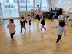 ぺんぎん組のお友達が、リズム遊びをおこないました。音楽やリズムに合わせてからだを動かしのびのびと遊んで