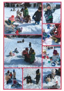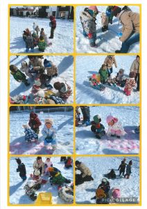 雪遊びに行く身支度も、少しずつ上達しているりす組さん。ぺんぎん組さんは、しっかり身支度ができます✨園庭での雪遊びもすっかり慣れているので、ダイナミックに遊んでいますよ🎵ゆか先生が、色水を用意し雪に色をつけると、いつもの雪とは違う遊び方を楽しめました😊