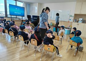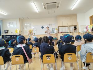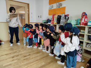 登園してきてから、持ってきた物や着てきた物を片付けて、朝の会からスタート。
