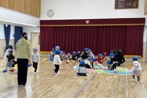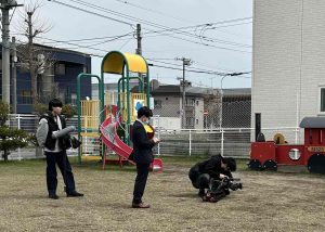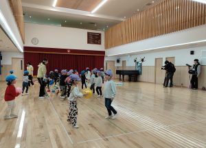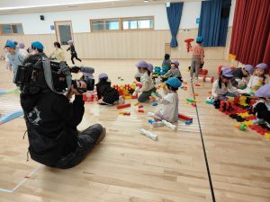 11時半頃から1時間ほど、記者さん・カメラマンさん・音声さんが来園し、ホールで遊ぶ子どもたちの様子や園庭の様子などを取材していきました。